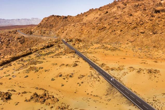 Routes fluides à travers vallées et plateaux désertiques.